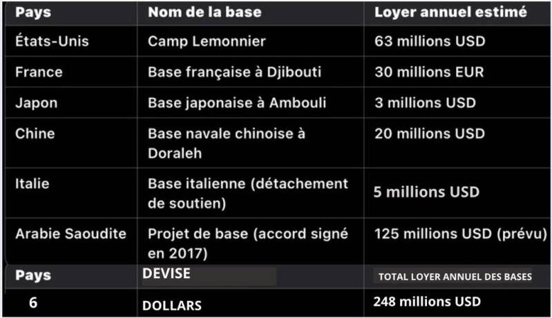 À l’entrée de la mer Rouge, au croisement des routes maritimes les plus fréquentées du globe, Djibouti s’impose comme un nœud géostratégique majeur. Sa position lui vaut d’accueillir, sur un territoire de moins de 23 000 km², les bases militaires de plusieurs puissances mondiales : les États-Unis, la France, la Chine, le Japon, l’Italie, et bientôt l’Arabie saoudite. En échange de ces implantations, l’État djiboutien perçoit chaque année des loyers considérables, estimés à près de 250 millions de dollars, selon les données compilées à ce jour.